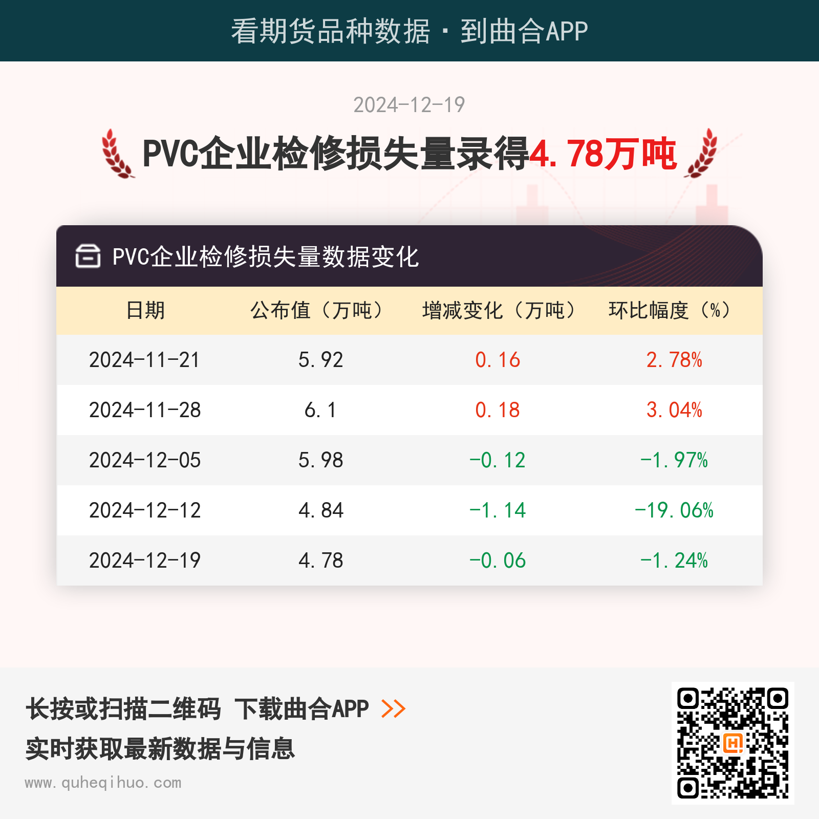 截止12月19日,PVC企业检修损失量为 4.78万吨,较上一周减少0.06万吨,环比跌幅1.24%。