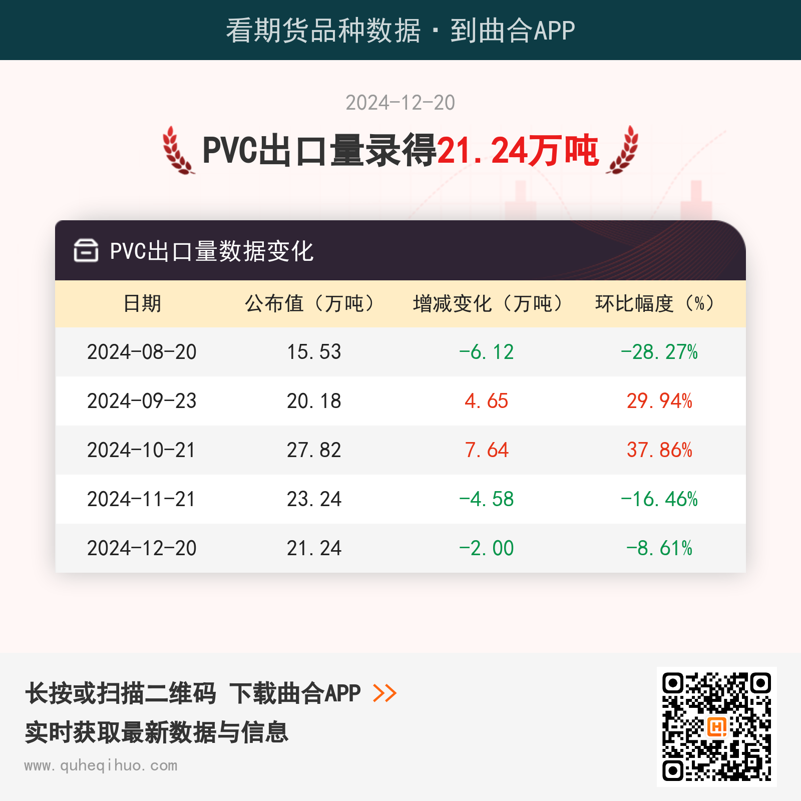 12月20日PVC出口量录得21.24万吨 2024-12-20 | 分类: 化工期货 | 查看: 51862 截止12月20日,PVC出口量为 21.24万吨,较上一月减少2.00万吨,环比跌幅8.61%。 近期PVC出口量数据变化如下:图片来源于网络,如有侵权,请联系删除 PVC期货实时行情 更新时间:---- 最新价 -- 涨跌值 -- 涨跌幅 -- 点击查看PVC最新行情走势 其它推荐 暂无相关文章 关键词: 上一篇:12月20日PVC进口量录得1.60万吨 下一篇:PVC期货12月20日主力小幅上涨0.12% 收报4999.0元