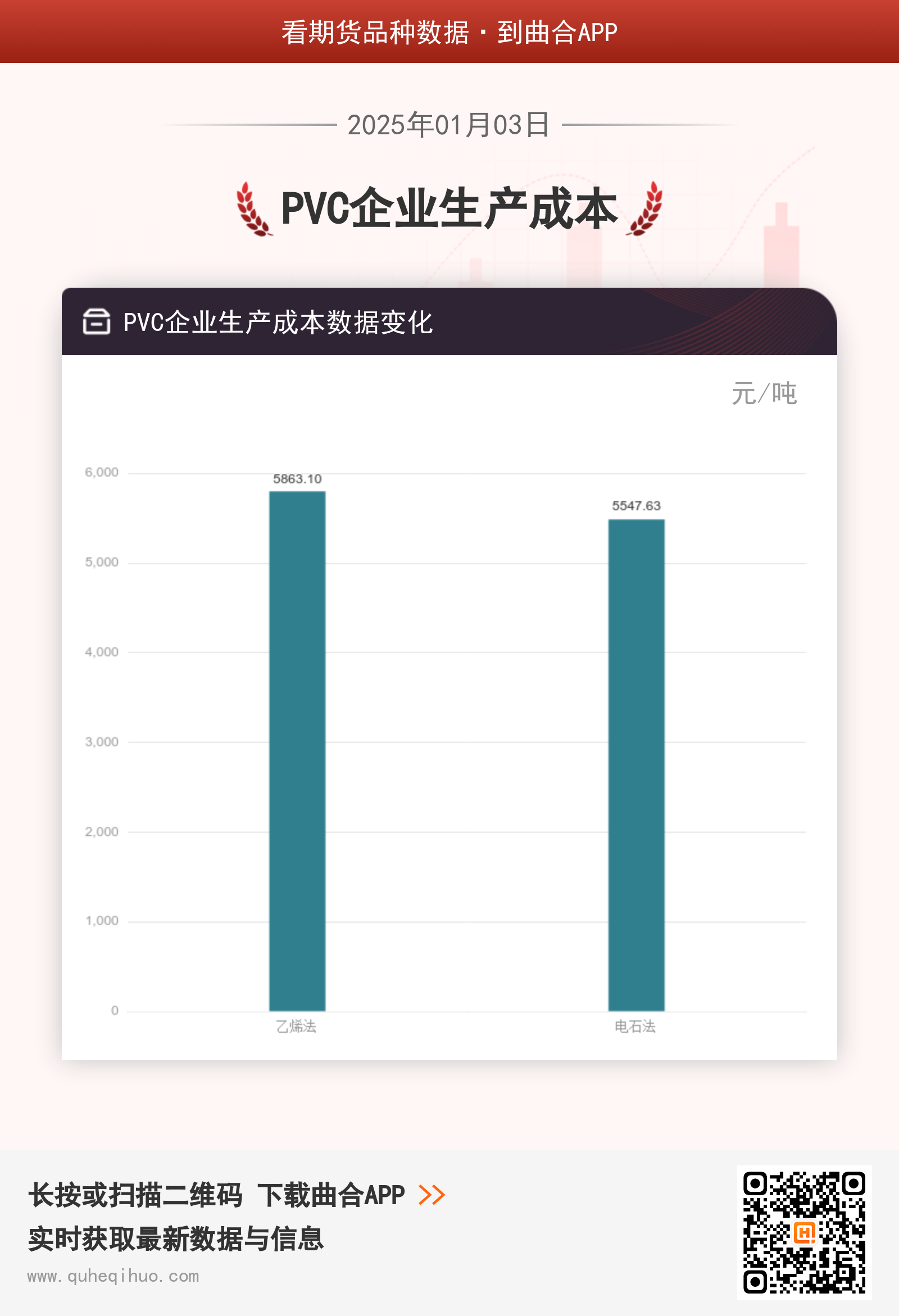 截止1月3日,乙烯法生产企业平均成本5863.10元/吨,较上一周增加1.33元/吨,环比涨幅0.02%。电石法生产企业平均成本5547.63元/吨,较上一周减少69.27元/吨,环比跌幅1.23%。