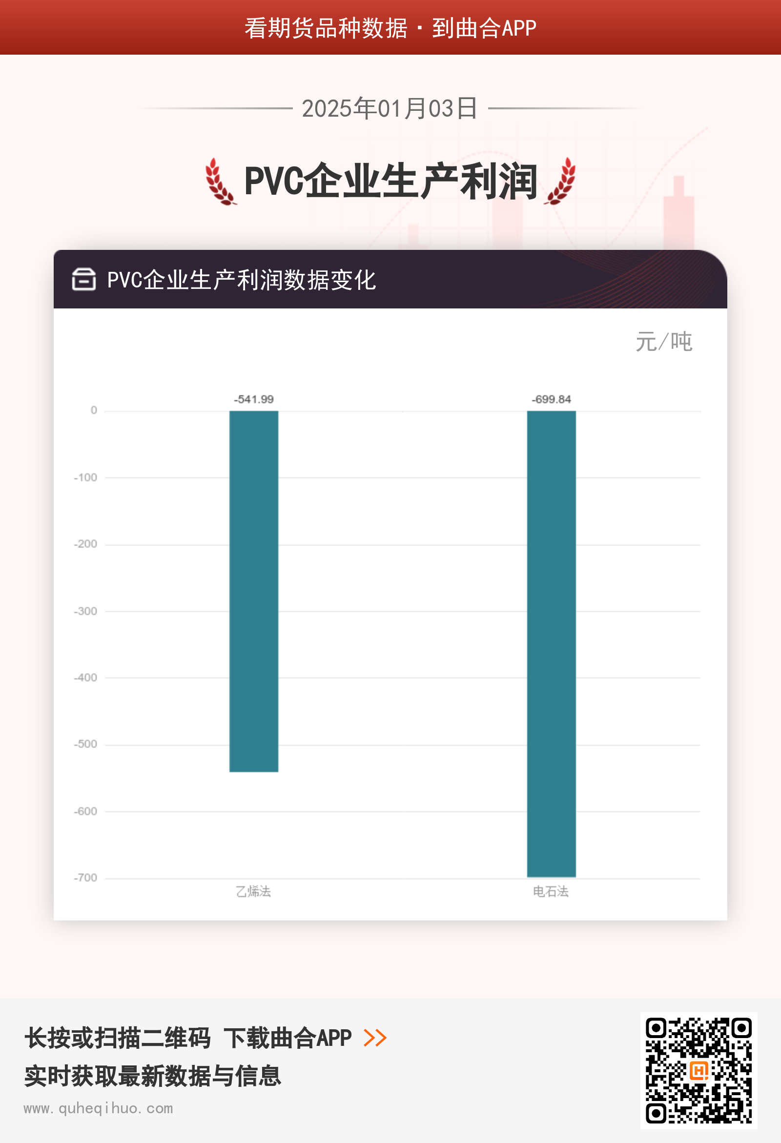 截止1月3日,乙烯法生产企业平均毛利-541.99元/吨,较上一周减少9.11元/吨,环比跌幅1.71%。电石法生产企业平均毛利-699.84元/吨,较上一周增加55.58元/吨,环比涨幅7.36%。